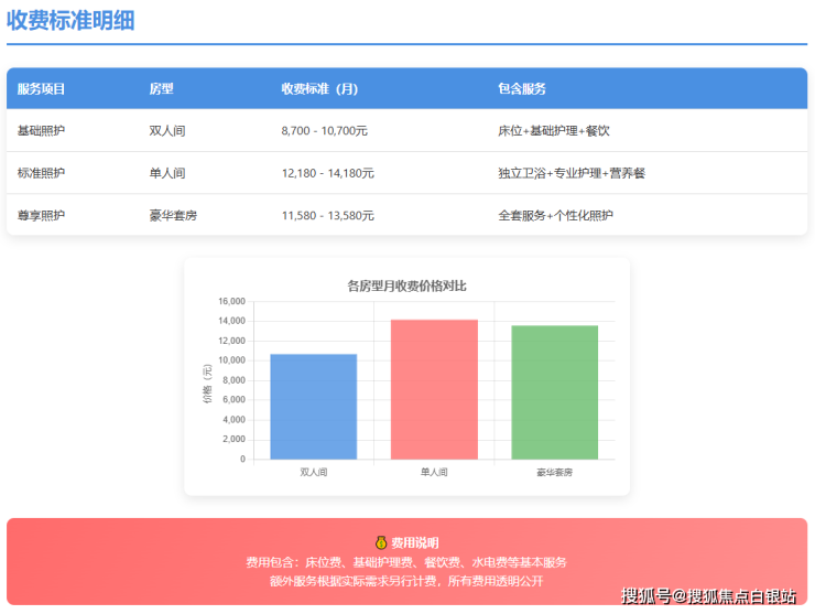 单人间:12000元/月起,配备独立卫浴、智能护理床及适老化家具