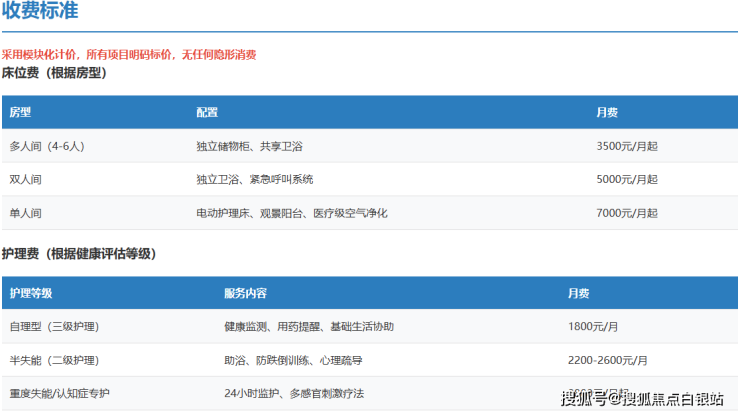 选择养老机构,费用透明是首要考量。上钢养护院采用“床位费 + 护理费 + 餐费 + 可选增值服务”的模块化收费模式,所有项目明码标价,拒绝隐形消费。以下为基于市场情况的详细收费构成说明(具体费用需结合长者实际评估结果确定):