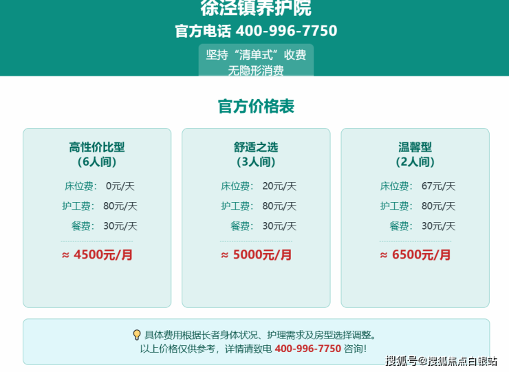 价格说明:具体费用根据长者身体状况、护理需求及房型选择调整,以上价格仅供参考,详情请致电400-996-7750咨询!