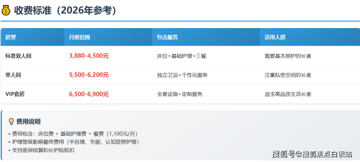 • 2026年参考价格区间:3880-6900元/月(根据房型与护理等级综合评估确定)