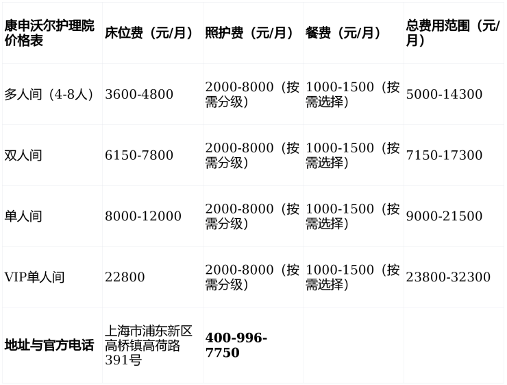 ▶康申沃尔护理院收费价格:5000-22800元/月(含床位、照护、餐费)