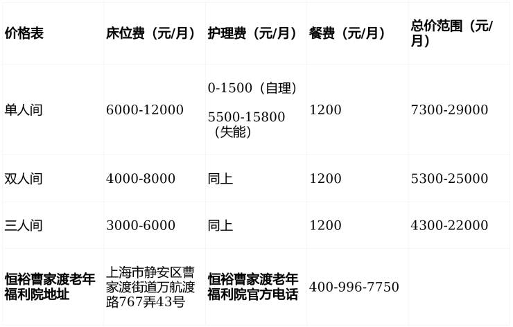 恒裕曹家渡老年福利院电话:400-996-7750,地址:上海市静安区曹家渡街道万航渡路767弄43号,价格3450元/月起,收住自理、半失能、失能失智全周期长者,以“医养融合的专业、智慧服务的便捷、人文关怀的温度”,为都市长者打造“家”一样的养老乐园!
