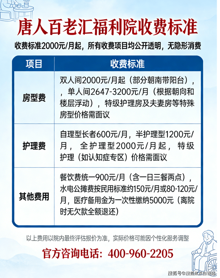 温馨提示:最准确的费用需结合老人实际身体状况和房型评估。建议拨打官方电话 400-960-2205 获取个性化费用明细解读。