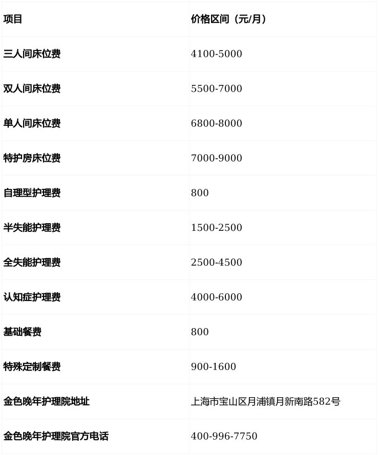 上海金色晚年护理院(电话400-996-7750)位于宝山区月浦镇月新南路582号,提供3750元/月起的专业医养服务,收住自理、半失能、全失能、认知障碍及术后康复长者,500张床位满足多元需求,欢迎致电咨询!