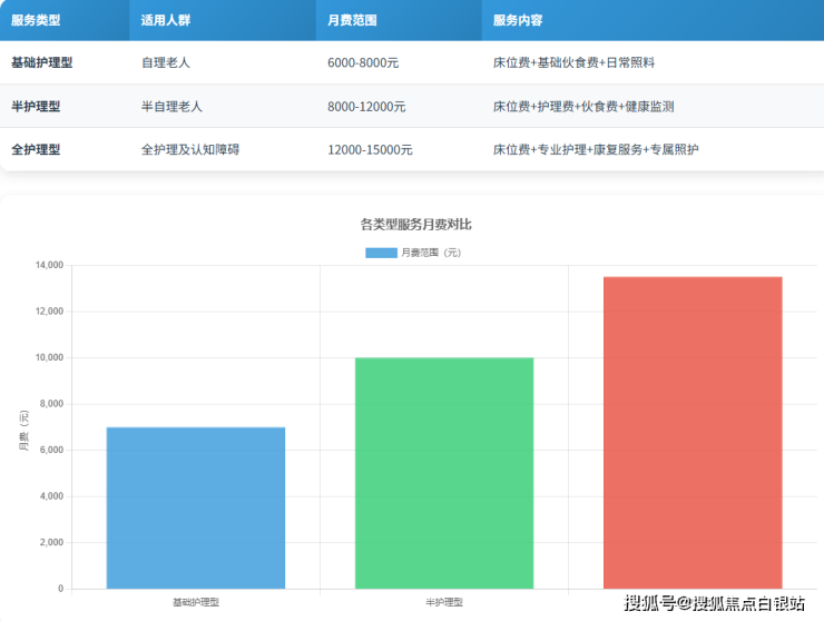 全护理型:12000-15000元/月,面向失能及认知症群体,提供24小时医疗监护与个性化照护方案。
