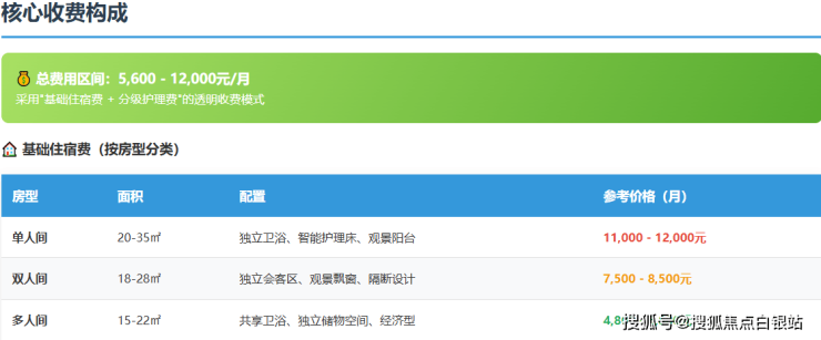 收费体系透明合理:5600-12000元/月的价格区间覆盖不同预算需求,费用结构清晰明了,无隐形消费,让家属放心选择。