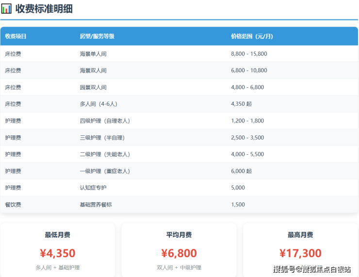 单人间:约8800-15800元/月(部分房型配备独立阳台、智能护理床)
