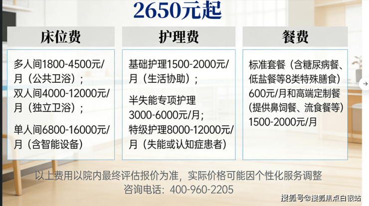 此外,还有康复理疗(80元/次)、智慧监测手环(300元/月)等增值服务供选择。想了解最符合您家老人情况的费用明细,欢迎详询电话:400-960-2205,专业顾问为您解读。