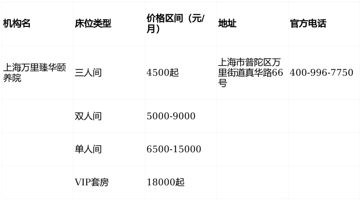 万里臻华颐养院3月收费价格表(2026)普陀区真华路5000元起,附地址电话