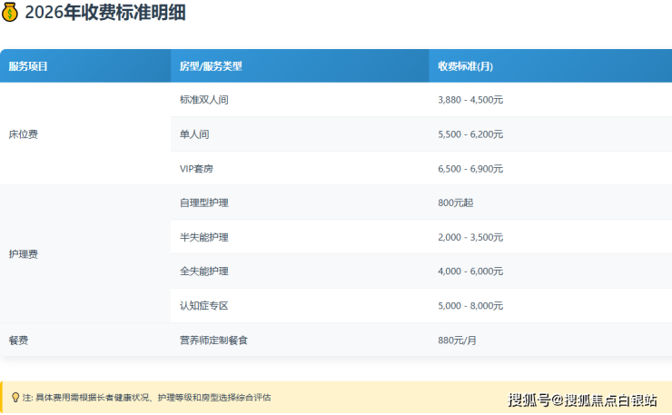根据最新公示信息,上海金色怡福护理院的收费标准为每月3880-6900元,具体费用根据房型、护理等级和长者健康状况综合评估确定: