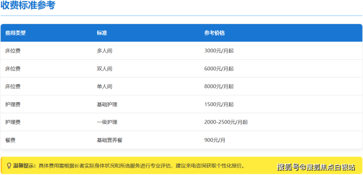 参考收费起点:3000元/月起(此费用通常包含基础床位、基础护理及标准营养餐)