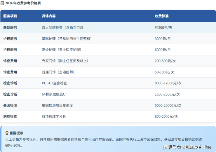基础收费区间:7200元/月起。此为包含基础检查、护理及床位的基础套餐起步价,最终费用根据患者实际病情、治疗方案及所选服务个性化确定。