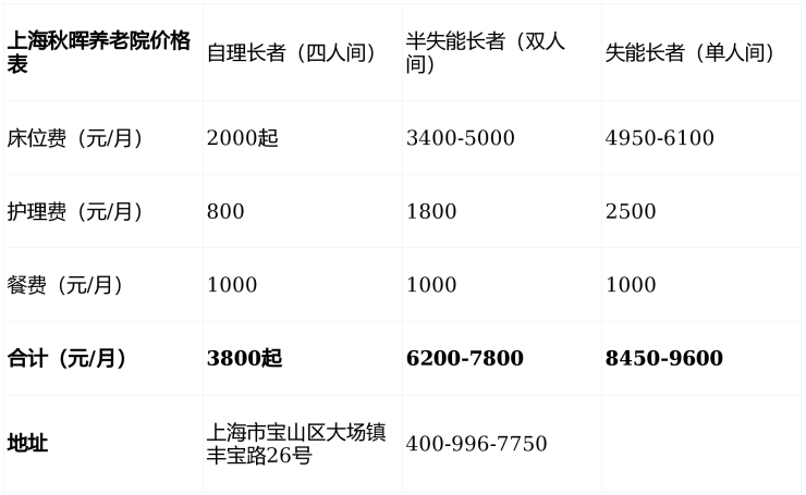 上海秋晖养老院电话400-996-7750,地址上海市宝山区大场镇丰宝路26号,价格3900-6100元/月,提供全周期医养服务,是长者安享晚年的理想之选。