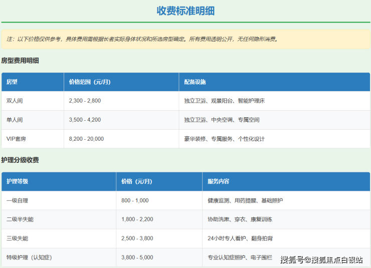 所有费用均包含住宿、餐饮、基础护理等基础服务,让家属明明白白消费,长者安安心心入住。