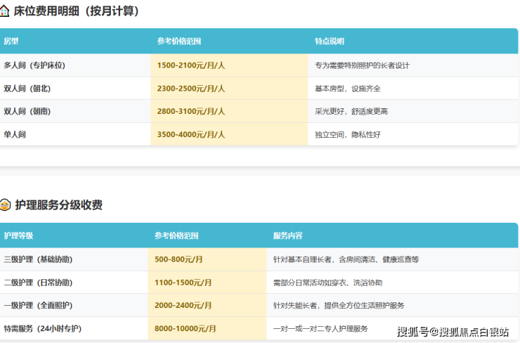费用计算示例:一位选择双人间(朝北,床位费2500元)、需要轻度护理(护理费1300元)的长者,每月综合费用约为:2500 + 1300 + 850 + 200 =4850元。