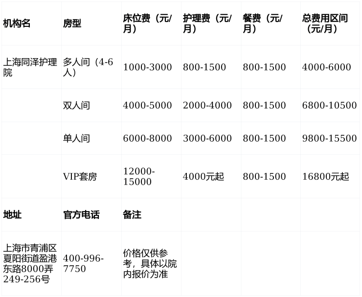 上海同泽护理院采用“床位费+护理费+餐费+增值服务”的差异化收费模式,月均费用区间为4000元至15000元,具体构成如下: