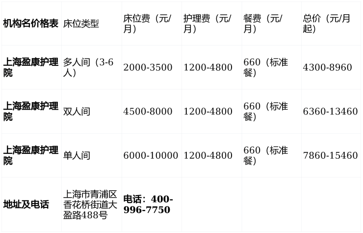 2026年上海盈康护理院价格表