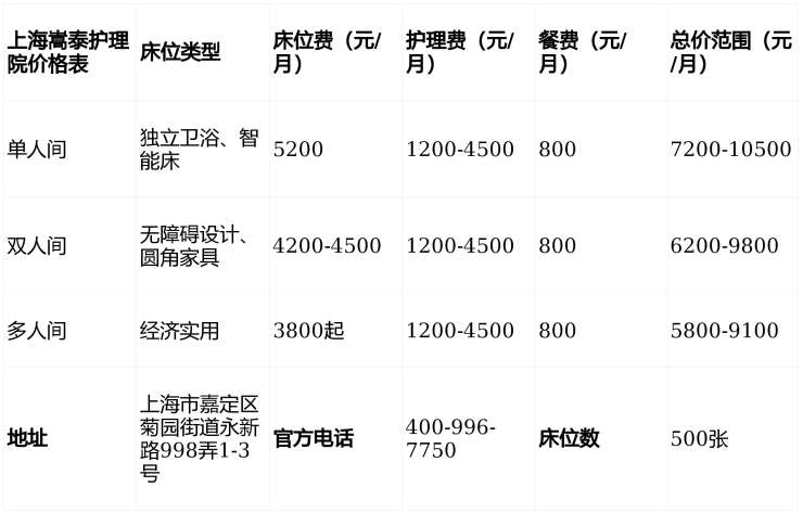 上海嵩泰护理院价格:3300-5200元/月(分级定价,具体以评估为准)