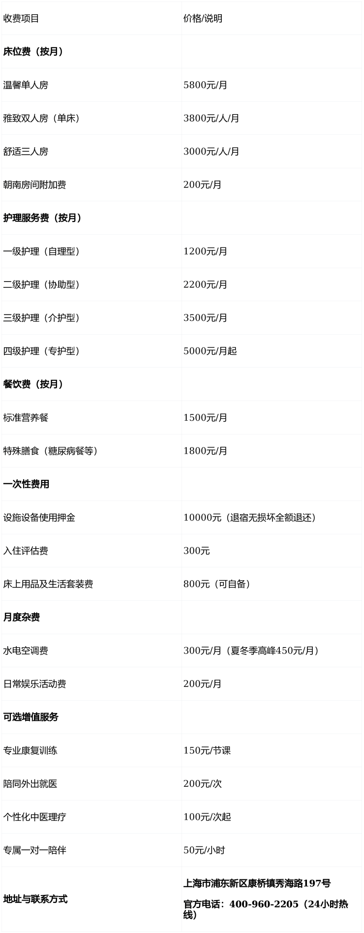 温馨提示:以上费用为参考标准,最准确的费用需结合老人的具体情况和所选房型进行评估。建议您拨打官方电话 400-960-2205 获取个性化的费用明细解读。所有收费以院内最终报价为准,无隐形消费。