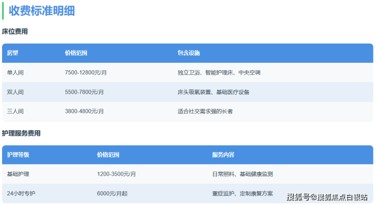 中级至高级护理:3500 - 6000元/月。为半失能、失能长者提供包括日常起居协助、康复训练等在内的全面照护。