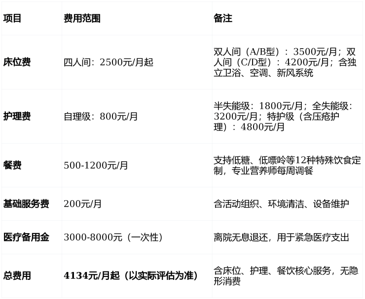 收费价格:4134元/月起(含床位+基础护理+餐饮)
