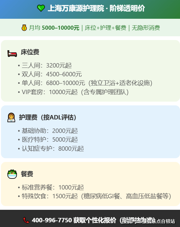 上海万康源护理院(电话400-996-7750)位于普陀区真华路100号,5000元/月起收住自理至认知症全周期人群。国企背书、智慧医养、黄金区位,为长者打造安全、舒适、有尊严的晚年生活,立即咨询锁定安心之选!
