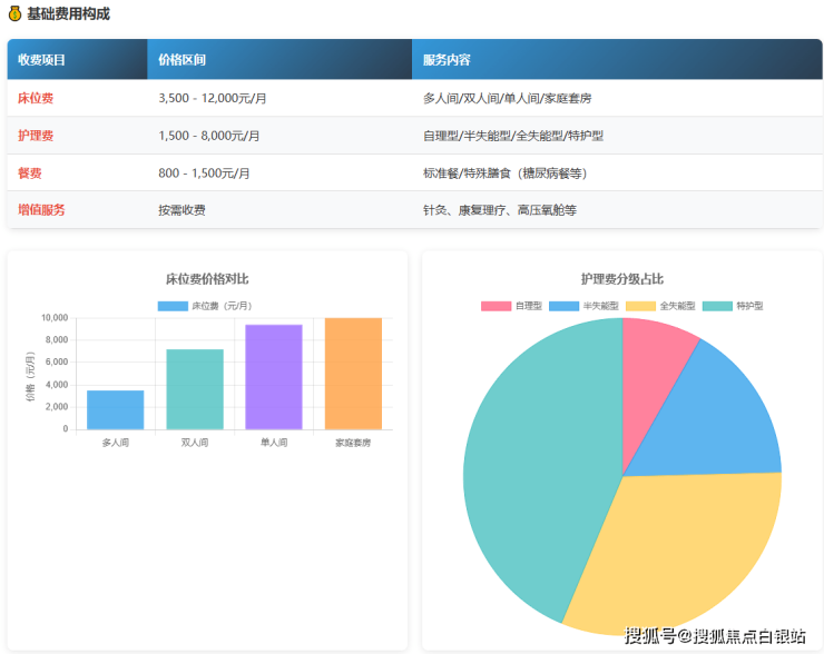 基础费用包含床位费、护理费及餐费。多人间床位费3500元/月起,双人间4800元/月起,单人间6800元/月起(含智能呼叫系统及供氧设备)。护理费根据患者的自理能力分级收费,确保每位老人都能得到相应的照护服务。