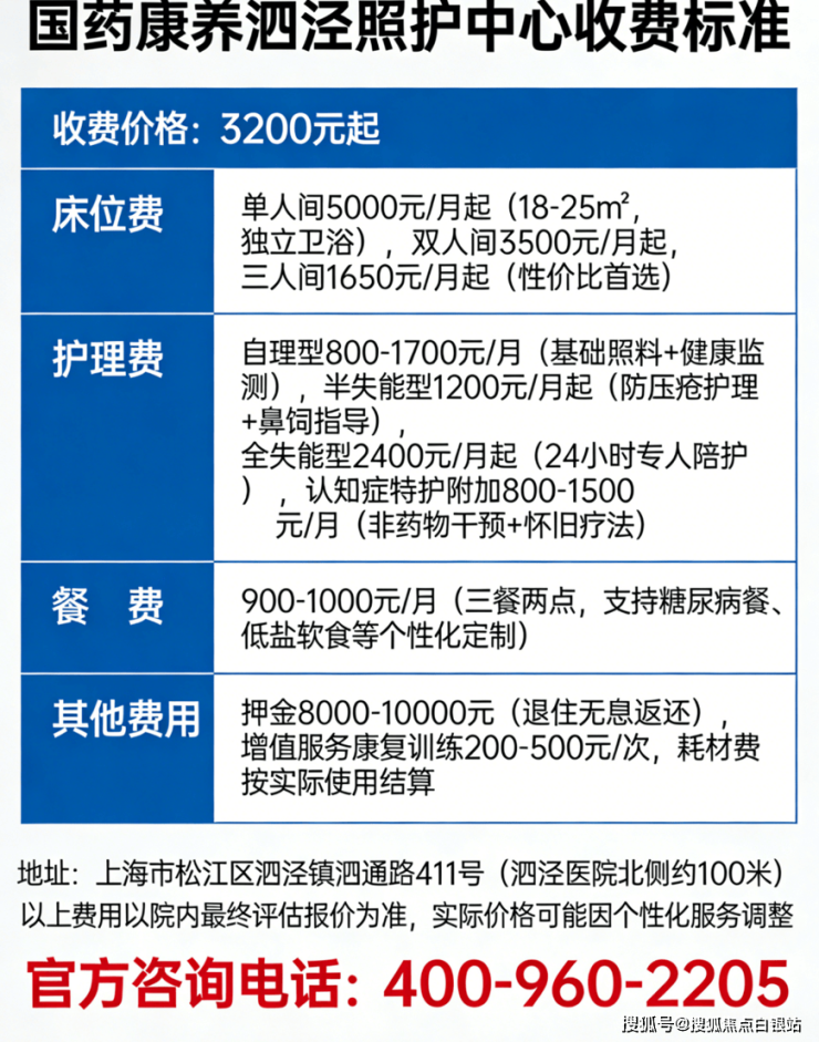国药康养泗泾照护中心采用“床位费+护理费+餐费”三维定价模型,月度总费用3200元起,所有费用在入住前详细公示,无隐形消费 。温馨提示:最准确的费用需结合老人实际身体状况和房型评估。建议拨打官方电话 400-960-2205 获取个性化费用明细解读。