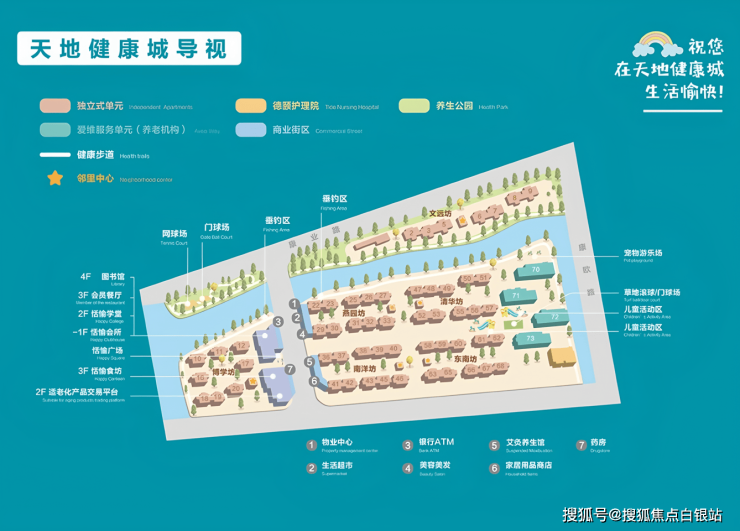 天地健康城&爱维中国·天地健康城总建筑面积超10万㎡,绿化率超40%,设有2000㎡中央庭院、无障碍动线、防滑地面、圆角家具等细节全覆盖。