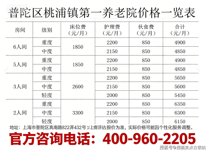 温馨提示:最准确的费用需结合老人的具体情况和所选房型进行评估。建议您拨打官方电话 400-960-2205获取个性化的费用明细解读。