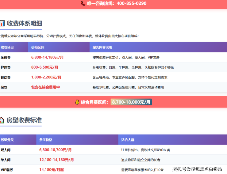 【重要提示】:以上价格为参考区间,具体收费标准可能因房型朝向、楼层位置、长者护理等级等因素有所调整。建议拨打400-855-0290获取最新报价单。