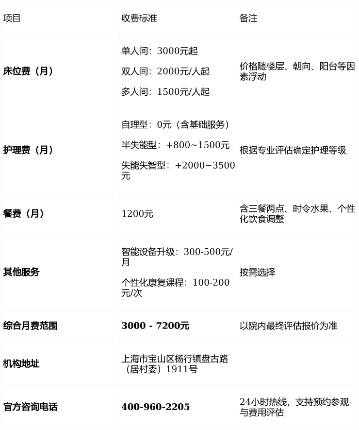 综合来看,一位半自理长者选择双人间,月总费用大约在4000-5000元区间;而需要全护理的长者,根据房型选择,总费用可能在5000-7200元/月。温馨提示:最准确的费用需结合老人实际身体状况和房型评估。建议拨打官方电话400-960-2205获取个性化费用明细解读。
