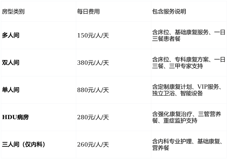 览海康复医院采用"房型+康复类型+医保权益"的透明收费模式,费用结构清晰明了。