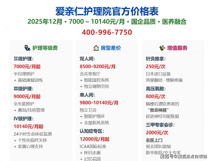 💰收费制度:7000元/月起,采用“基础费+护理分级+房型差价”模式,月均费用7000-10140元,无隐形消费!