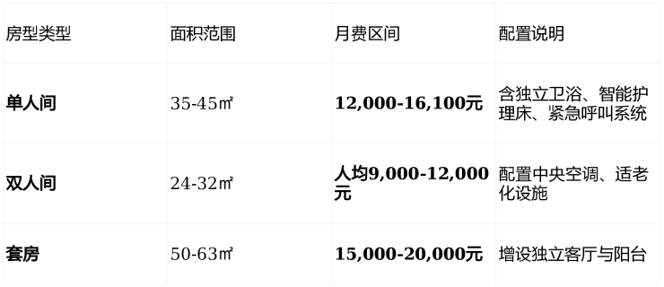 基础费用主要包含床位费和基础生活照料服务,根据房型不同分为三个档次: