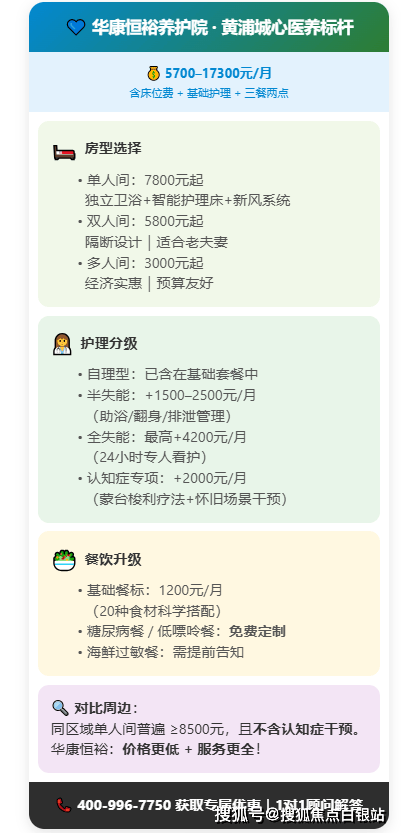 💰 收费区间:5700-17300元/月(含床位费+基础护理+三餐两点)