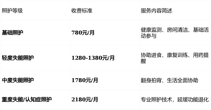 常见组合(双人间+轻度失能照护+标准餐):2600+1380+800=4780元/月