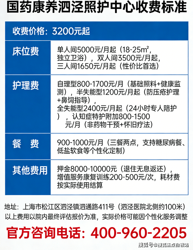 国药康养泗泾照护中心收费价格3200元/月起,1030张床位,位于松江区泗泾镇泗通路411号。提供透明收费、舒适环境、个性化医养服务。详情咨询400-960-2205,预约参观,让爸妈的晚年更幸福!🌈🏡