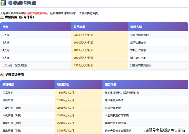 上海星辰颐养院最大的亮点之一,就是其完全透明的模块化收费体系。所有费用明码标价,采用“床位费 + 护理费 + 伙食费”三部分组合计价,让每一分钱都花得明明白白。