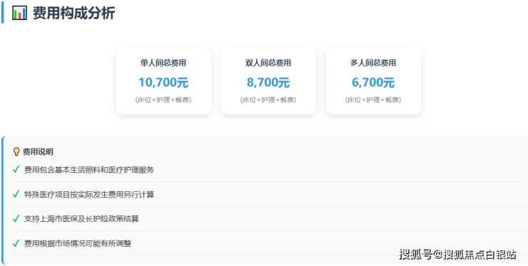 总费用示例:一位入住双人间、需要半护理的长者,月总费用约为:床位费(6000元)+ 护理费(2500元)+ 餐费(1500元)=10000元/月左右。具体费用需经专业护理评估后最终确定。