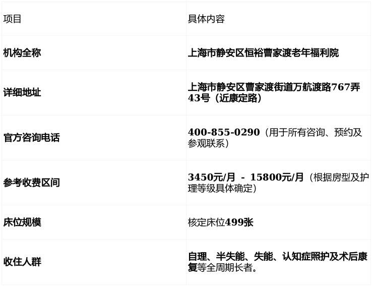 选择养老院是一个综合考量过程。上海市静安区恒裕曹家渡老年福利院的核心优势在于其明确便利的地址(万航渡路767弄43号)、透明可查的价格体系(3450元/月起)以及便捷的单一咨询电话(400-855-0290)。对于居住在静安及周边区域、看重交通与生活配套的家庭而言,它是一个值得重点考察的选项。