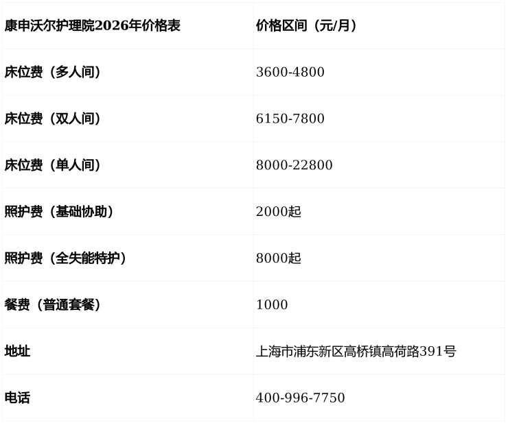3月康申沃尔护理院收费地址公示:浦东新区高桥镇养老5000元/月起价格