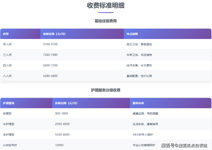 收费是决策中最实际的部分。半淞园兰公馆老年公寓采用“基础住宿费 + 分级护理费 + 个性化服务费”的透明化梯度定价模式,杜绝隐性消费。总费用因长者选择的房型、所需的护理等级而异。