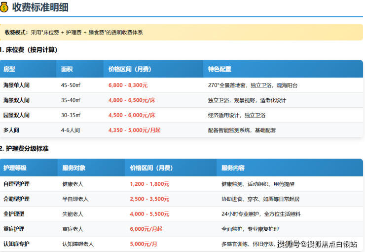 重要说明:以上价格为参考区间,具体收费需根据长者身体状况、护理等级评估及房型选择确定。费用包含基础住宿、餐饮、日常护理等服务项目。增值服务如康复理疗、特殊膳食等需另行计费。