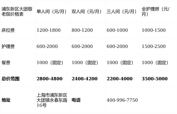 浦东新区大团敬老院电话400-996-7750,地址上海市浦东新区大团镇永春东路16号,价格1200元-5000元/月,提供从自理到失能的全周期医养服务,欢迎咨询预约参观。