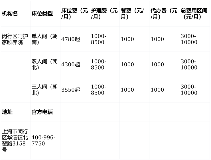 一句话简介:闵行区呵护家颐养院电话400-996-7750,地址位于华漕镇北翟路3158号,提供3000元起/月的分层收费服务,涵盖自理、半失能、失能及认知障碍长者,以专业医养、花园环境、亲情服务打造品质晚年生活。