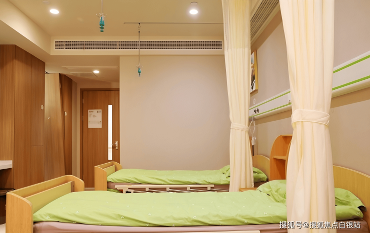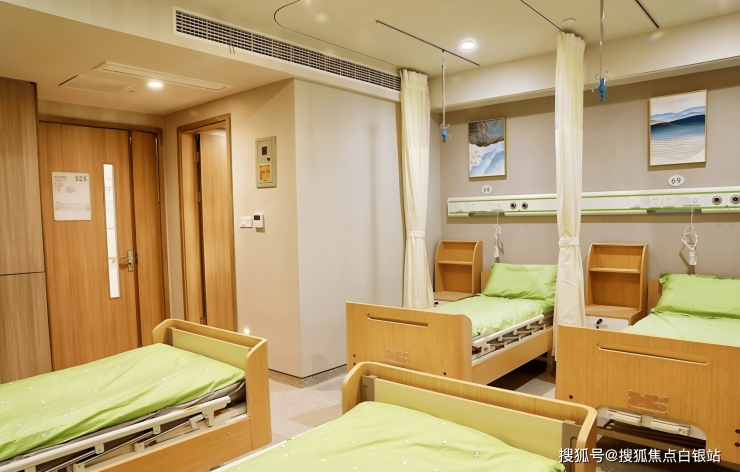护理照护区:双人间带独立卫浴,防滑地板+紧急拉绳,床头装智能呼叫系统。