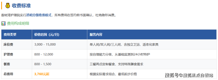 香树湾护理院采用"床位费+护理费+餐费"的清晰收费模式: