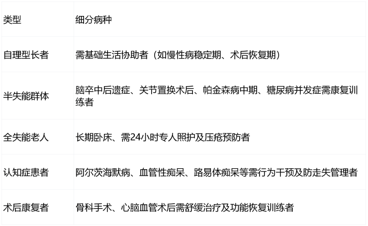 收住人群:自理型长者、半失能/全失能老人、认知症患者(禁忌传染病及急性重症患者)