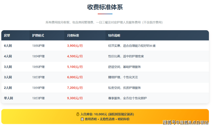 基本费用包含住宿、餐饮、基础护理服务,特殊医疗及个性化服务需另行收费。